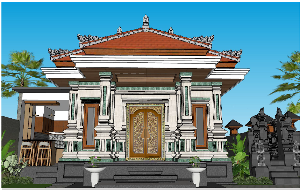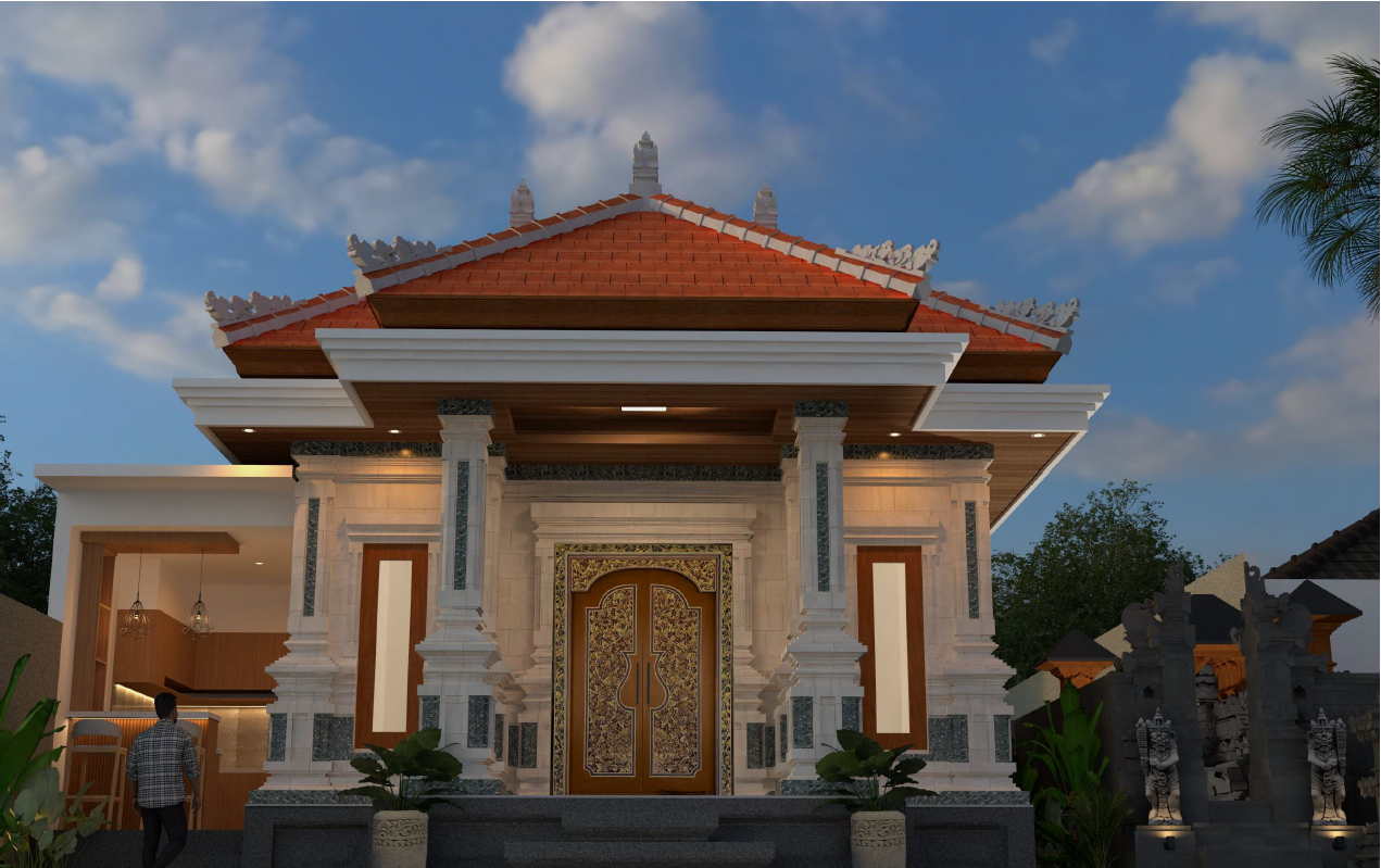 Desain mengusung gaya modern minimalis yang bersih dan sederhana, namun tetap mempertahankan elemen khas Bali seperti penggunaan batu alam, tata letak merajan, dan komposisi ruang yang selaras dengan nilai tradisional.